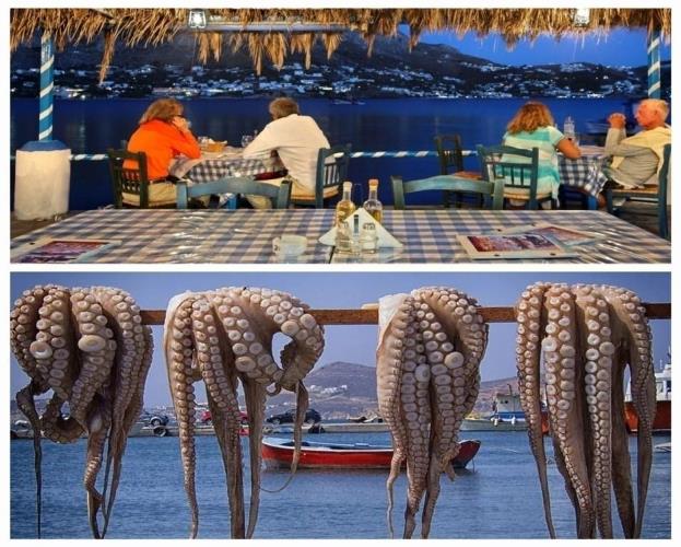 13.Οι ψαράδες των νησιών μας και οι ταβερνιάρηδες μας αρέσκονται να διαφημίζουν την πραμάτεια τους με πολλούς τρόπους και ιδιαίτερα όταν απλώνουν στον ήλιο τα χταπόδια κρεμασμένα σε σχοινί προς θέα των πελατών, που δεν χάνουν την ευκαιρία να φωτογραφίζονται με φόντο τα νόστιμα και φρεσκότατο αυτά θαλασσινά εδέσματα.