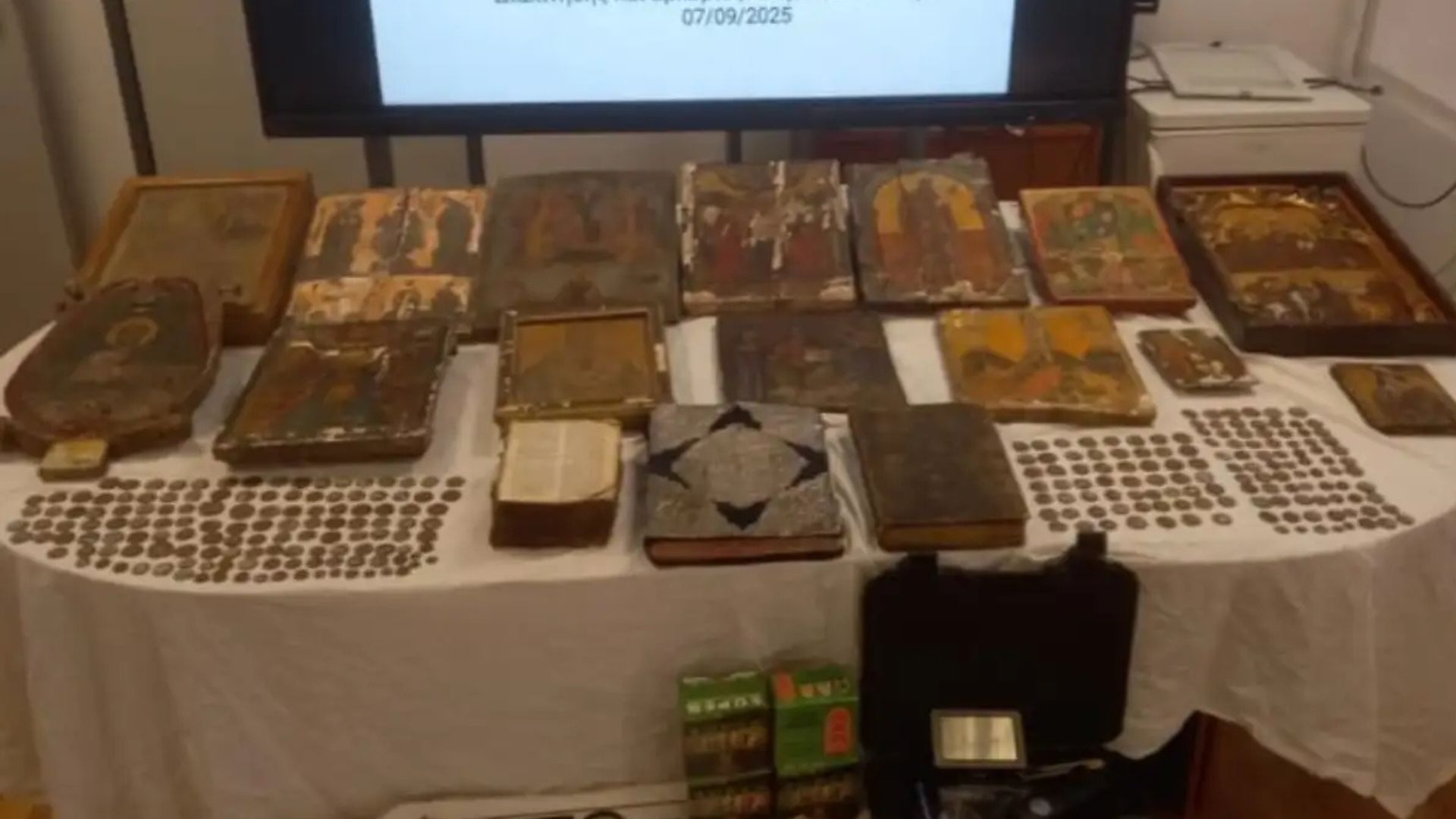 Όπως επισημαίνεται στη σχετική ανακοίνωση η προέλευση των παραπάνω κατασχεθέντων εικόνων, των δύο Ιερών Ευαγγελίων και του εκκλησιαστικού βιβλίου βρίσκεται υπό διερεύνηση, ενώ θα παραδοθούν για φύλαξη και εκτίμηση στις αρμόδιες υπηρεσίες του Υπουργείου Πολιτισμού.