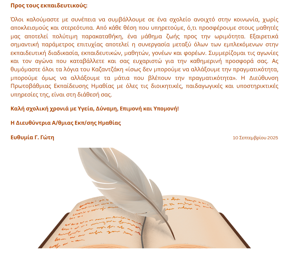 Θέματα Παιδείας Τοπικά ΔΙΠΕ Ημαθίας: Ευχές της Διευθύντριας για τη νέα σχολική χρονιά Faretra.info 10/09/2025, 21:03 Share on Facebook Share on Twitter Send with mail ΔΙΠΕ Ημαθίας: Ευχές της Διευθύντριας για τη νέα σχολική χρονιά Φαρέτρα ΔΙΠΕ Ημαθίας Ευθυμία Γώτη νέα σχολική χρονιά ΣΧΕΤΙΚΑ ΑΡΘΡΑ Εργασιακά ΣΕΠΕ Ημαθίας: Πλαίσιο εργασιακών δικαιωμάτων των εκπαιδευτικών για τη σχολική χρονιά 2025-2026