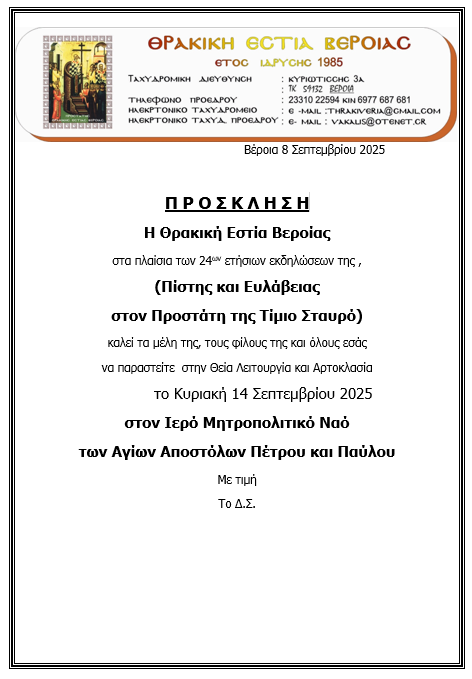 Πρόσκληση από τη Θρακική Εστία Βέροιας σε θεία λειτουργία / Κυριακή 14 Σεπτεμβρίου