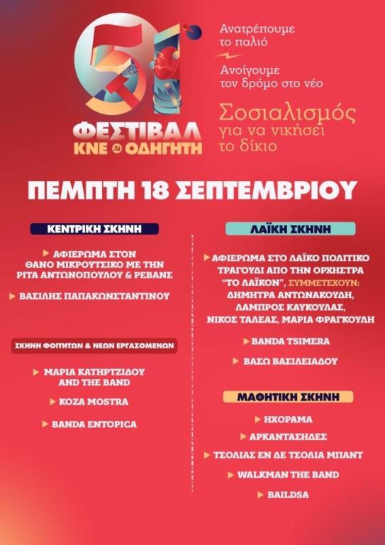 Θεσσαλονίκη: Ξεκινά σήμερα το 51ο Φεστιβάλ ΚΝΕ – Οδηγητή / 18, 19 & 20 Σεπτεμβρίου