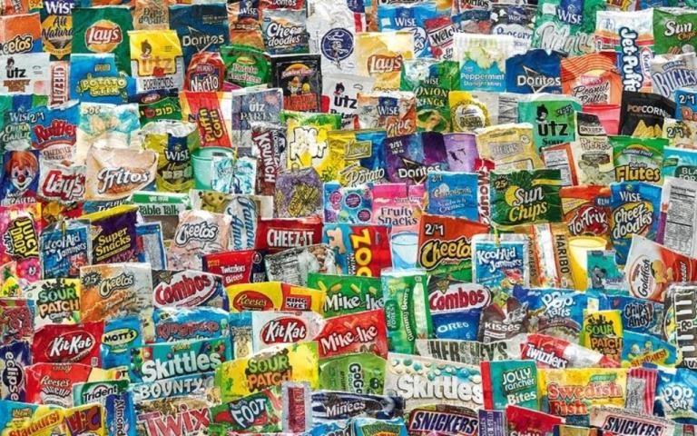 Κάποια από αυτά τα περιτυλίγματα δεν κυκλοφορούν πια στην αγορά και καθώς τα τοποθετεί λοιπόν στις συνθέσεις του καταγράφονται τα διατροφικά γούστα μιας άλλης εποχής.