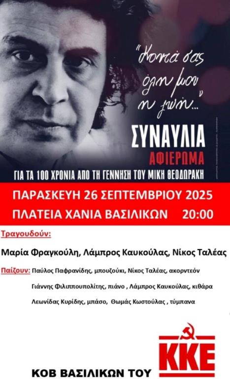 Συναυλία – αφιέρωμα για τα 100 χρόνια από τη γέννηση του Μ. Θεοδωράκη, στα Βασιλικά Θεσσαλονίκης / Παρασκευή 26 Σεπτεμβρίου