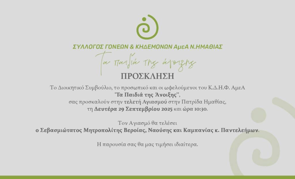 Βέροια Εκδηλώσεις Τοπικά Τα Παιδιά της Άνοιξης: Πρόσκληση τελετής Αγιασμού | Δευτέρα 29 Σεπτεμβρίου Faretra.info 25/09/2025, 00:05 Share on Facebook Share on Twitter Send with mail Τα Παιδιά της Άνοιξης: Πρόσκληση τελετής Αγιασμού – Φαρέτρα Παιδιά Άνοιξης ΣΧΕΤΙΚΑ ΑΡΘΡΑ Δεν υπάρχουν σχετικά άρθρα.