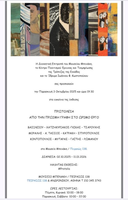 Μουσείο Μπενάκη – Έκθεση: “ΠΡΩΤΟΛΕΙΑ. Από την πρώιμη γραφή στο ώριμο έργο” / εγκαίνια, Παρασκευή 3 Οκτωβρίου