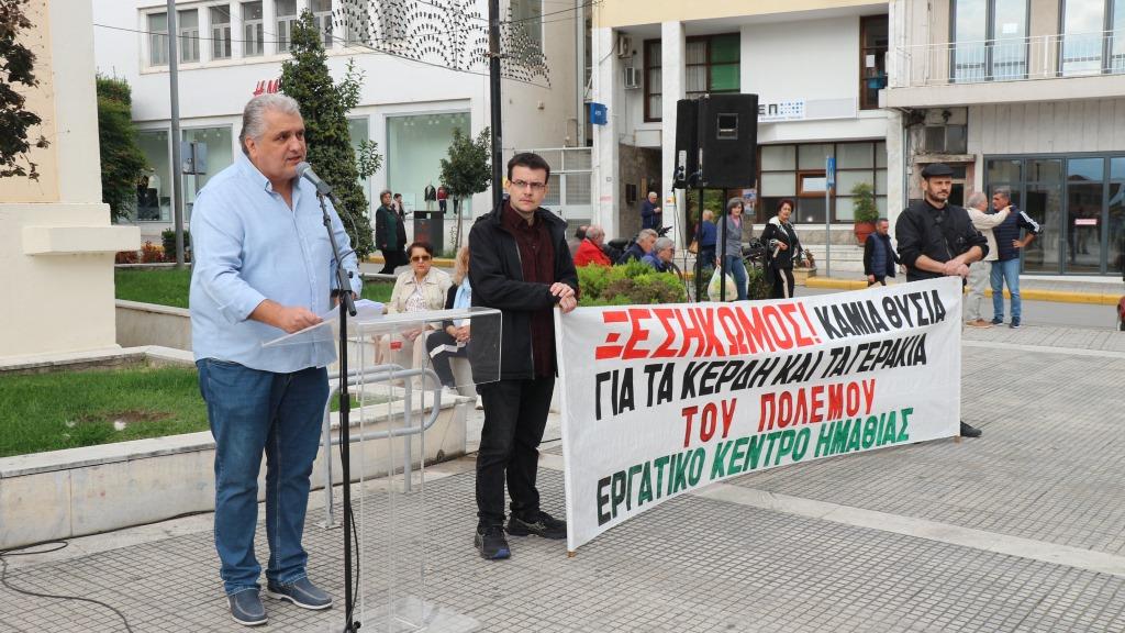 Βρισκόμαστε σήμερα στην απεργιακή μας συγκέντρωση, σε αυτήν εδώ την πλατεία, γιατί εμείς νιώθουμε καλά όταν είμαστε μαζί με τα ταξικά μας αδέλφια, τους εργαζόμενους στον ιδιωτικό τομέα. Όταν δίνουμε τη μάχη χέρι-χέρι, πλάι-πλάι με τα ταξικά σωματεία, με το Εργατικό Κέντρο Ημαθίας που είναι αυτό που πρωτοστατεί σε κάθε μικρό και μεγάλο αγώνα, που δεν το ψάχνουν οι εργαζόμενοι όπως συμβαίνει με τα άφαντα Εργατικά Κέντρα της Βέροιας και της Αλεξάνδρειας.