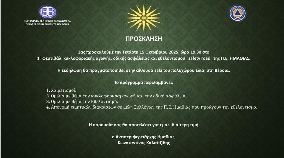 Π.Ε. Ημαθίας: 1ο φεστιβάλ κυκλοφοριακής αγωγής, οδικής ασφάλειας και εθελοντισμού / Βέροια, Τετάρτη 15 Οκτωβρίου