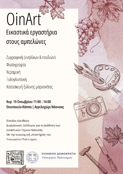 Ο Σύλλογος για την Διάδοση των Εικαστικών Τεχνών πραγματοποιεί τη δράση “OinArt – Εικαστικά Εργαστήρια στους αμπελώνες”. Τα βιωματικά εικαστικά εργαστήρια στόχο έχουν να εγείρουν την δημιουργικότητα επισκεπτών και κατοίκων της πόλης στα πλαίσια δημιουργικού τουρισμού.