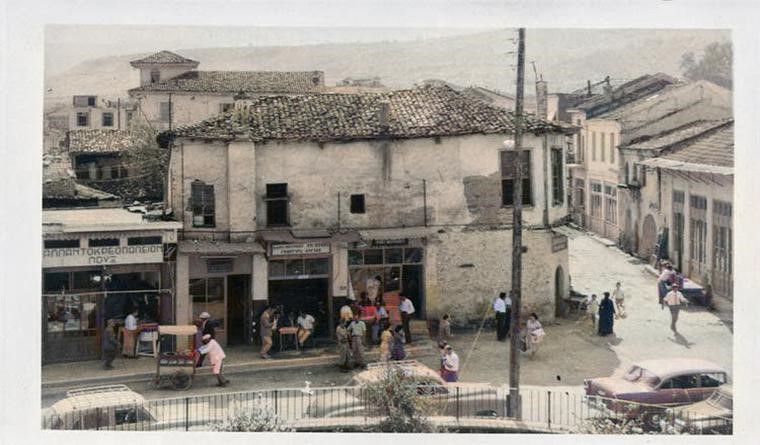 Γωνία Μαλακούση και Παναγή Τσαλδάρη. Φωτογραφία τραβηγμένη από το καμπαναριό του Αγίου Αντωνίου. Το αλλαντοκρεοπωλείο ΛΟΥΞ, το καφενείο, ο πλανόδιος με το καρότσι, το κέντρο της Βέροιας μίας άλλης εποχής.