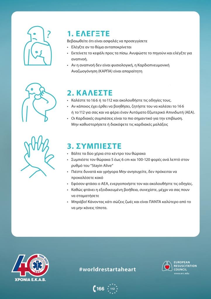 Το ΕΚΑΒ, στα πλαίσια της «Παγκόσμιας Ημέρας Επανεκκίνησης Καρδιάς», στις 16 Οκτωβρίου 2025, προσκαλεί τους πολίτες σε όλη την Ελλάδα σε μια σειρά εκδηλώσεων με στόχο την πληροφόρηση, την εκπαίδευση αλλά και την ευαισθητοποίησή τους σχετικά με την εξέχουσα σημασία της Καρδιοπνευμονικής Αναζωογόνησης (ΚΑΡΠΑ) αλλά και της χρήσης του Αυτόματου Εξωτερικού Απινιδωτή (CPR/AED), για την υποστήριξη της καρδιακής λειτουργίας και την επιβίωση των θυμάτων καρδιακής ανακοπής.