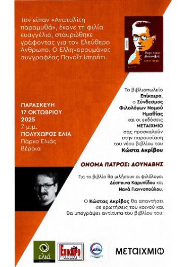 Παρουσίαση βιβλίου: Κώστας Ακρίβος «Όνομα πατρός Δούναβης» / Βέροια, Παρασκευή 17 Οκτωβρίου