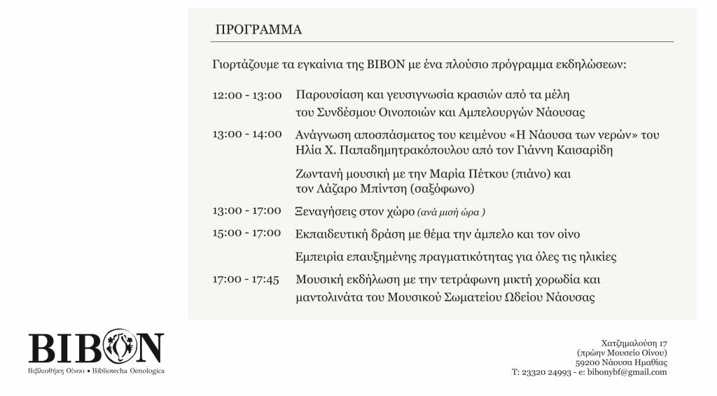 Τα εγκαίνια της ΒΙΒΟΝ, την Κυριακή 9 Νοεμβρίου, είναι ανοικτά προς όλους, προσφέροντας ένα πλούσιο πρόγραμμα εκδηλώσεων. Συμπίπτοντας με την Παγκόσμια Ημέρα Οινοτουρισμού, η πρώτη Βιβλιοθήκη Οίνου της χώρας μας αποτελεί έναν ξεχωριστό προορισμό. Μια απαραίτητη στάση, ένα σημείο συνάντησης και ενημέρωσης για τα οινοποιεία της περιοχής, που αξίζει να έχει θέση στο πρόγραμμα του επισκέπτη της Νάουσας.