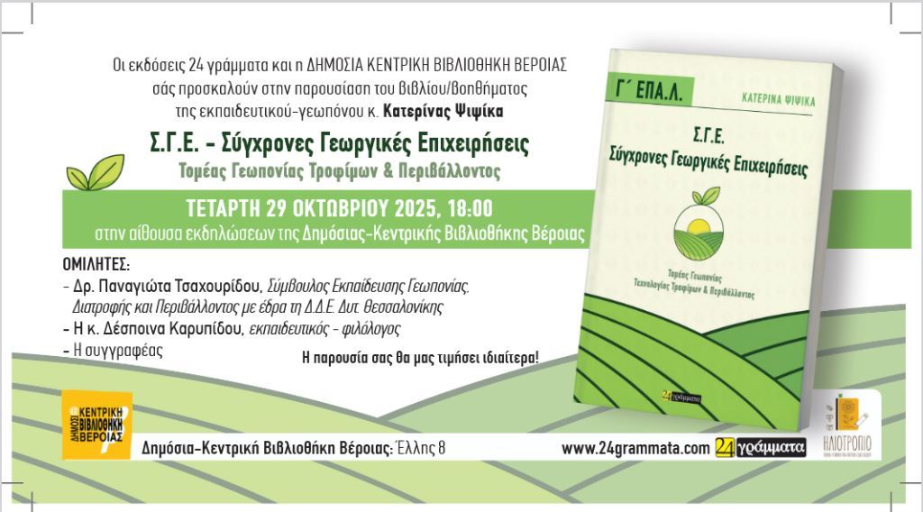 Οι εκδόσεις 24 Γράμματα και η Δημόσια Κεντρική Βιβλιοθήκη Βέροιας σας προσκαλούν στην παρουσίαση του βιβλίου/βοηθήματος της εκπαιδευτικού – γεωπόνου κ. Κατερίνας Ψιψίκα με τίτλο «Σ.Γ.Ε Σύγχρονες Γεωργικές Επιχειρήσεις, Τομέας Γεωπονίας Τροφίμων & Περιβάλλοντος»