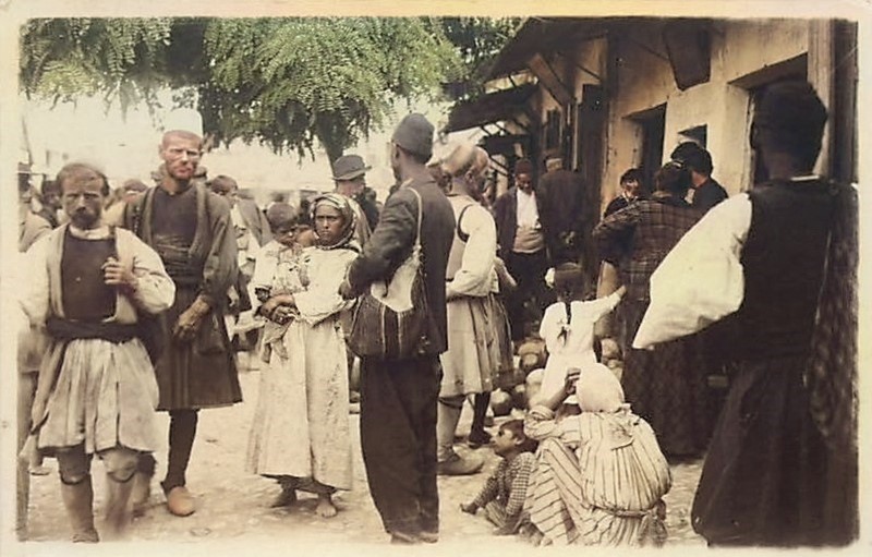 Μια πολυσύχναστη αγορά στη Βέροια του 1918, με πολύ κόσμο που φαίνεται να συναλλάσσεται και να συνομιλεί…