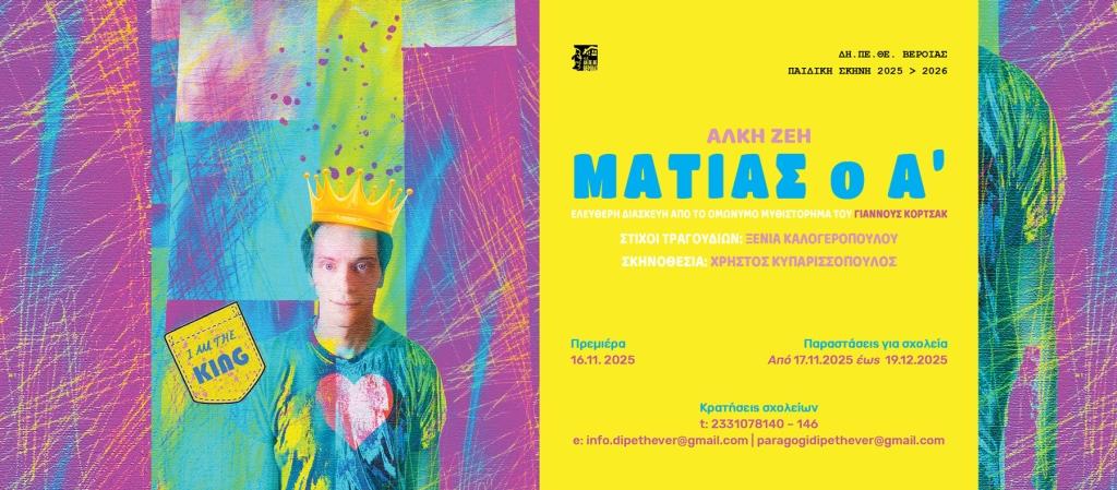 Η Παιδική Σκηνή 2025-2026 του ΔΗ.ΠΕ.ΘΕ. Βέροιας παρουσιάζει το έργο “Ματίας ο Πρώτος”, σε θεατρική διασκευή της Άλκης Ζέη και σε στίχους τραγουδιών της Ξένιας Καλογεροπούλου, υπό την καθοδήγηση και σκηνοθεσία του Χρήστου Κυπαρισσόπουλου. Η παράσταση θα κάνει πρεμιέρα για όλους την Κυριακή 16 Νοεμβρίου 2025 στην Αντωνιάδειο Στέγη Γραμμάτων και Τεχνών και έπειτα θα ανοίξει την πόρτα της σε σχολεία (Δημοτικά και Γυμνάσια) για το διάστημα 17 Νοεμβρίου έως 19 Δεκεμβρίου.