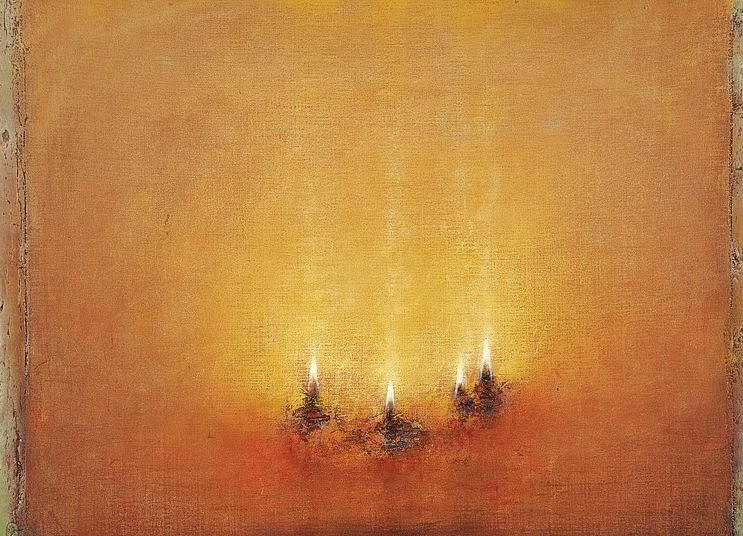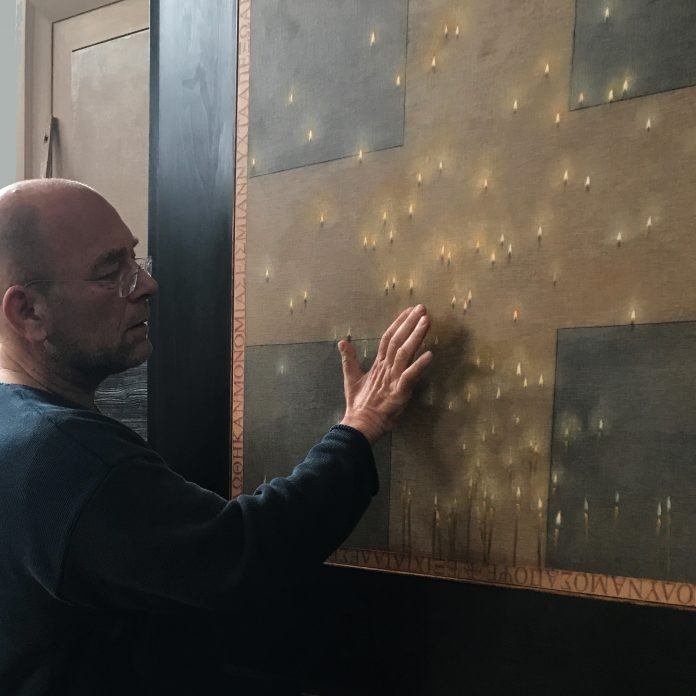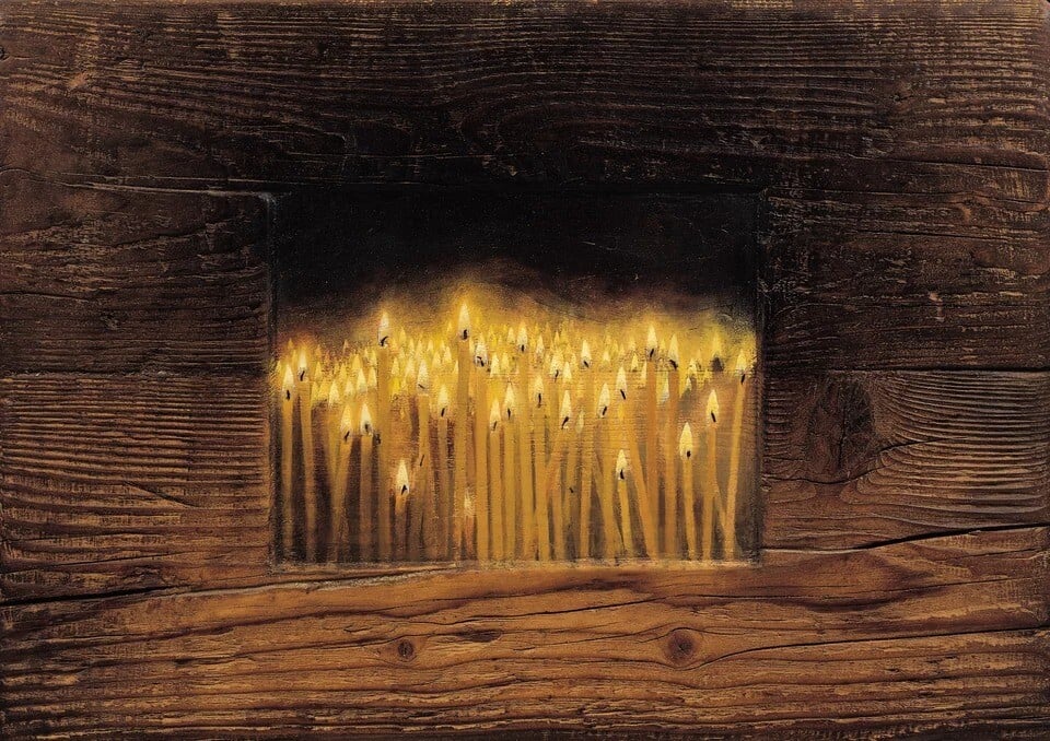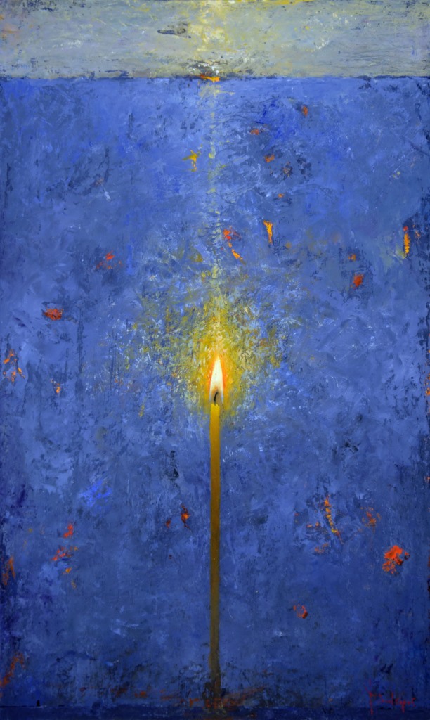 Τα αναμμένα κεριά, που τρεμοπαίζουν σε χέρια ή σε υποβλητικό κοντράστ με τον σκοτεινό τους φόντο, αναπαράγονται στα περισσότερα έργα του σαν συνεχής υπόμνηση της πάλης του φωτός με το σκοτάδι. “Χειροτεχνήματα”, όπως λέει ο ίδιος, “που πασχίζουν να αποδώσουν αχειροποίητο νόημα”. Και εκφραστές αυτής της πάλης στα έργα του είναι και οι ήρωες νεκροί του τόπου, που αποδίδονται μυσταγωγικά.