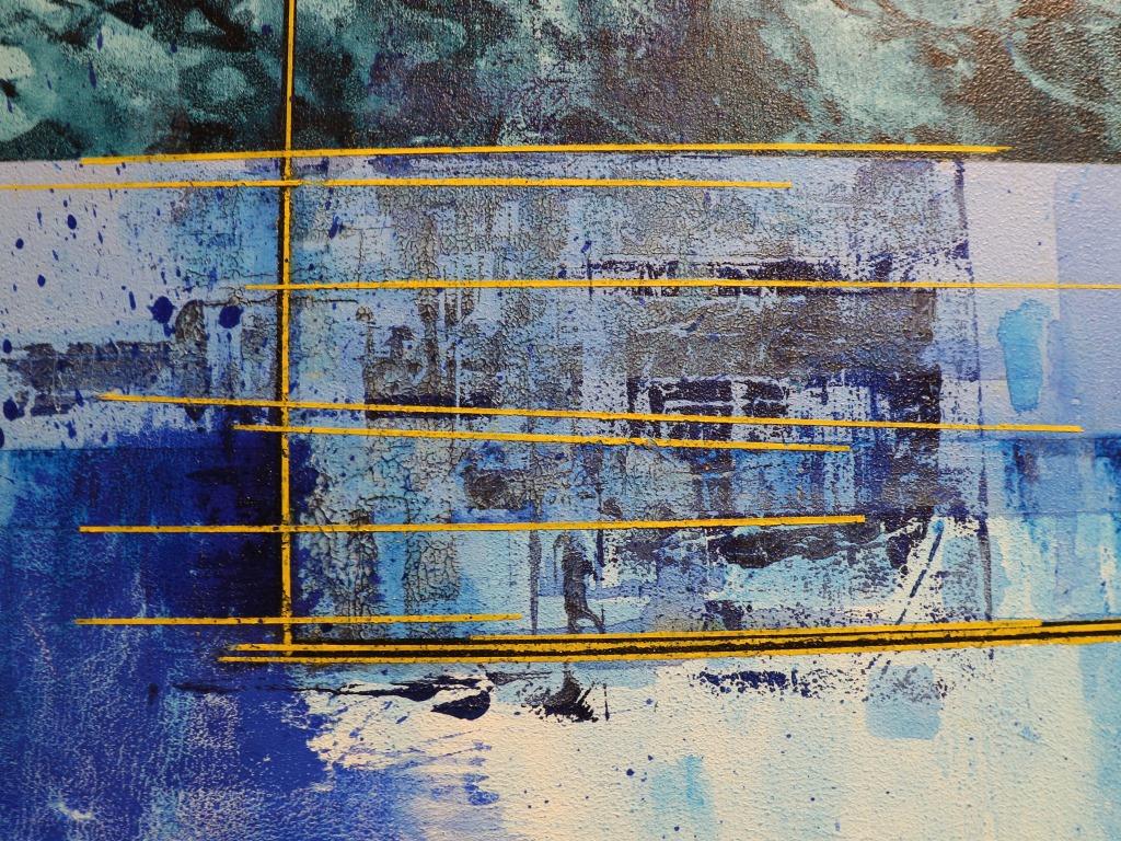 Είναι ακρυλικά, μελάνι, (που συμβολίζει το μόνιμο), ακουαρέλα, σπρέι και φυσικά το μπλε που το δημιουργώ κάθε φορά μόνη μου. Σε μερικούς πίνακες συνυπάρχουν όλα αυτά μαζί, ακόμη και χαρακιές με το κοπίδι μου. Ακόμη και η άμμος χρησιμοποιήθηκε κάπου ή το νερό της βροχής.