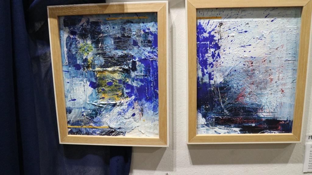 Στον εκθεσιακό χώρο, γεμάτο από κόσμο, το μπλε της Αμνιώτη θριάμβευσε, αφού μετακινήθηκε στους πίνακές της αλλάζοντας μορφές, σχήματα, ρευστότητα ή στατικότητα, υποδηλώνοντας άλλοτε χώρους, άλλοτε φυσικές καταστάσεις και πάντοτε συναισθήματα.