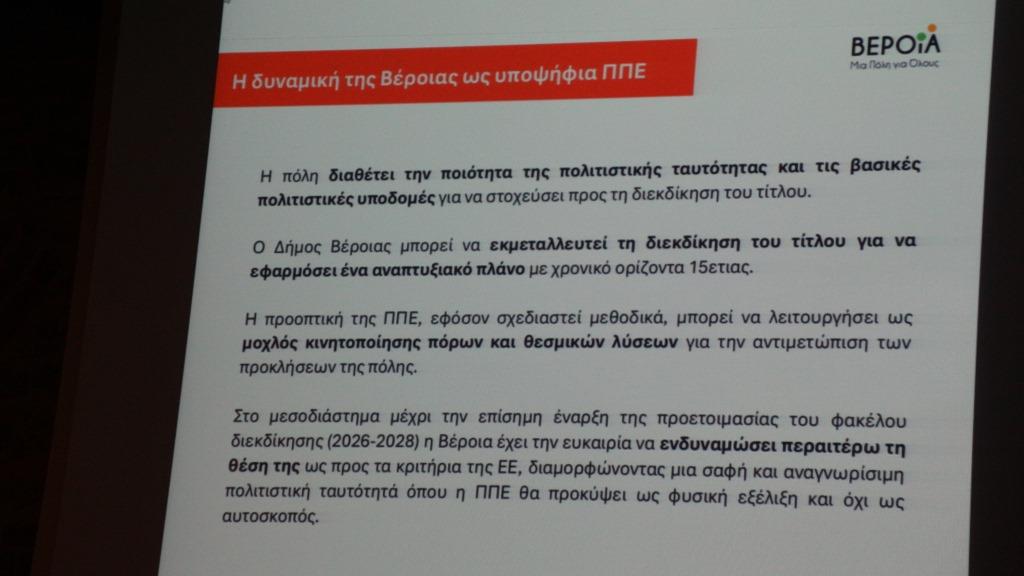 Μετά από σύντομη ενημέρωση του Αντιδήμαρχου Τουρισμού Λάζαρου Ασλανίδη για τις πρώτες συζητήσεις που έγιναν το 2022 για την υποψηφιότητα της Βέροιας και την μελέτη για το πώς πρέπει να υποστηριχθεί αυτή, που ολοκληρώθηκε το 2025, ο λόγος δόθηκε στον Γιάννη Τροχόπουλο, που ενημέρωσε το κοινό για τα αποτελέσματα της μελέτης.