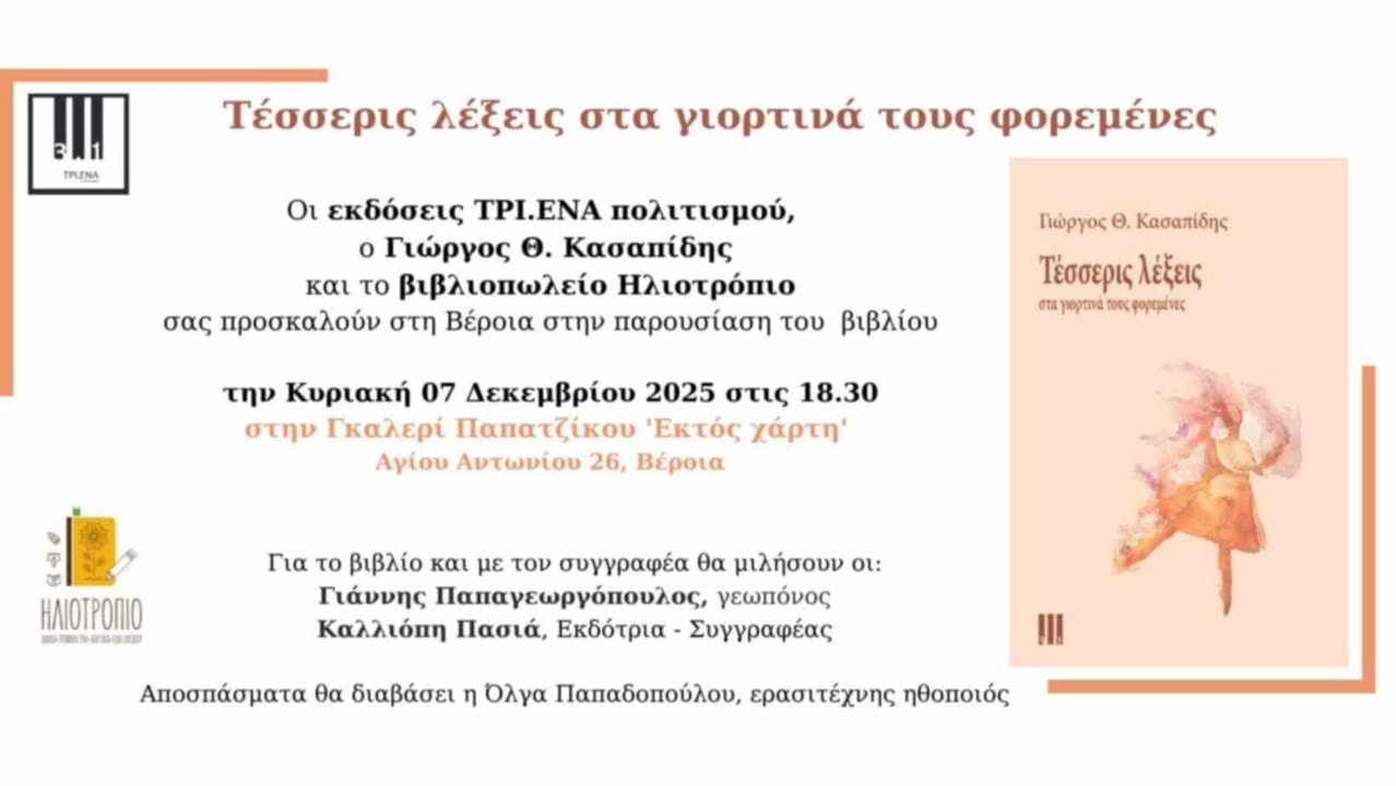 Παρουσίαση βιβλίου: Γιώργος Θ. Κασαπίδης “Τέσσερις λέξεις στα γιορτινά τους φορεμένες” / Βέροια, Κυριακή 7 Δεκεμβρίου