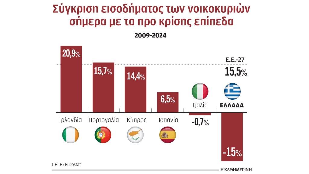 Το 2024, το πραγματικό εισόδημα των ελληνικών νοικοκυριών παραμένει 15% χαμηλότερο από αυτό του 2009.