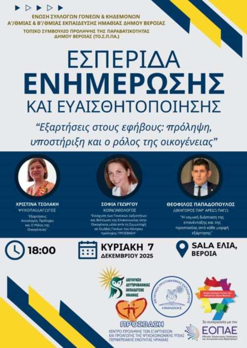 Εσπερίδα για τις εξαρτήσεις στους εφήβους από την Ένωση Συλλόγων Γονέων Ημαθίας / Κυριακή 7 Δεκεμβρίου