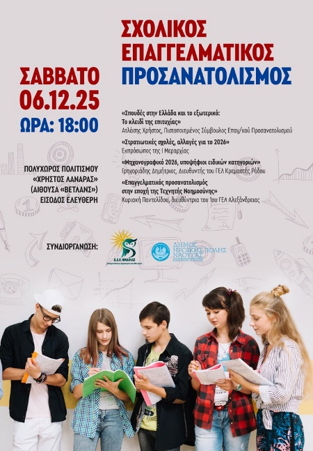 Η Διεύθυνση Δευτεροβάθμιας Εκπαίδευσης Ημαθίας σε συνεργασία με τον Δήμο Ηρωικής Πόλης Νάουσας- Αντιδημαρχία Παιδείας, Nεολαίας, και Αθλητισμού, αναγνωρίζοντας την συνεχή ανάγκη για ενημέρωση μαθητών και γονέων σε θέματα που άπτονται του επαγγελματικού προσανατολισμού, διοργανώνουν σχετική εκδήλωση το Σάββατο 6 Δεκεμβρίου 2025 στις 18:00 στον πολυχώρο πολιτισμού «Χρήστος Λαναράς»-Αίθουσα ΒΕΤΛΑΝΣ.
