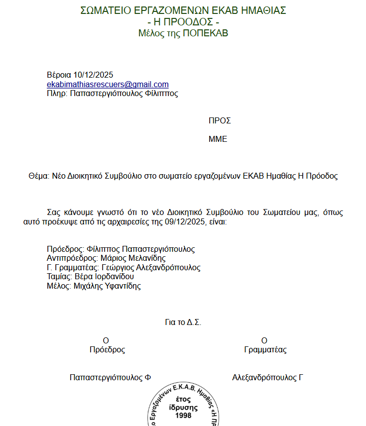 Σας κάνουμε γνωστό ότι το νέο Διοικητικό Συμβούλιο του Σωματείου μας, όπως αυτό προέκυψε από τις αρχαιρεσίες της 09/12/2025, είναι: