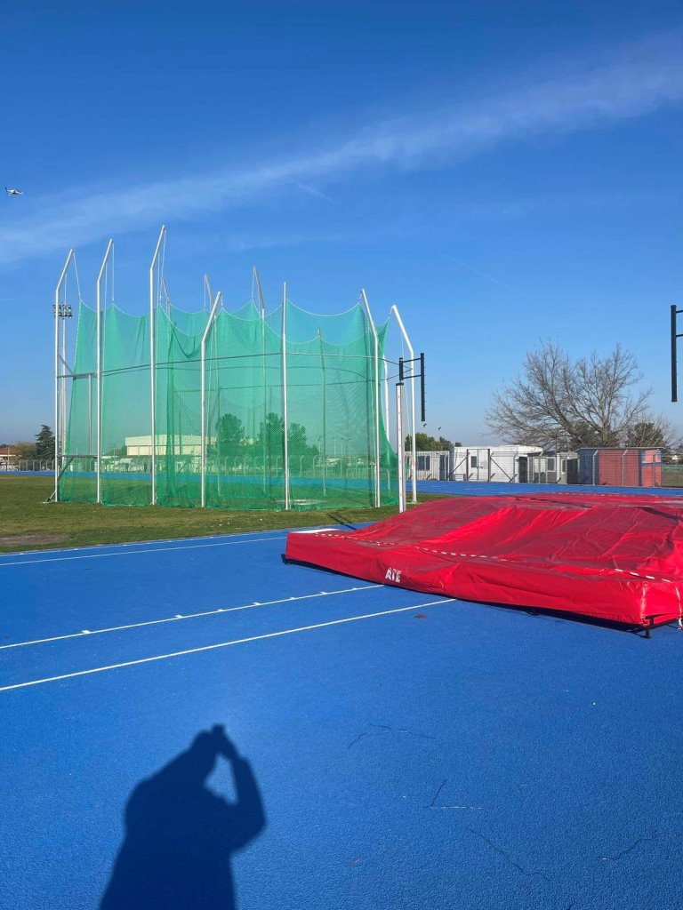 Τοποθέτηση νέου στρώματος και ορθοστάτη άλματος επί κοντώ συνοδευόμενo από τα πιστοποιημένα προστατευτικά ασφαλείας της χρήσης του