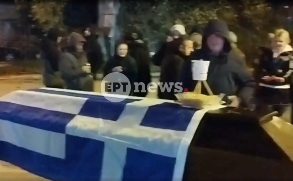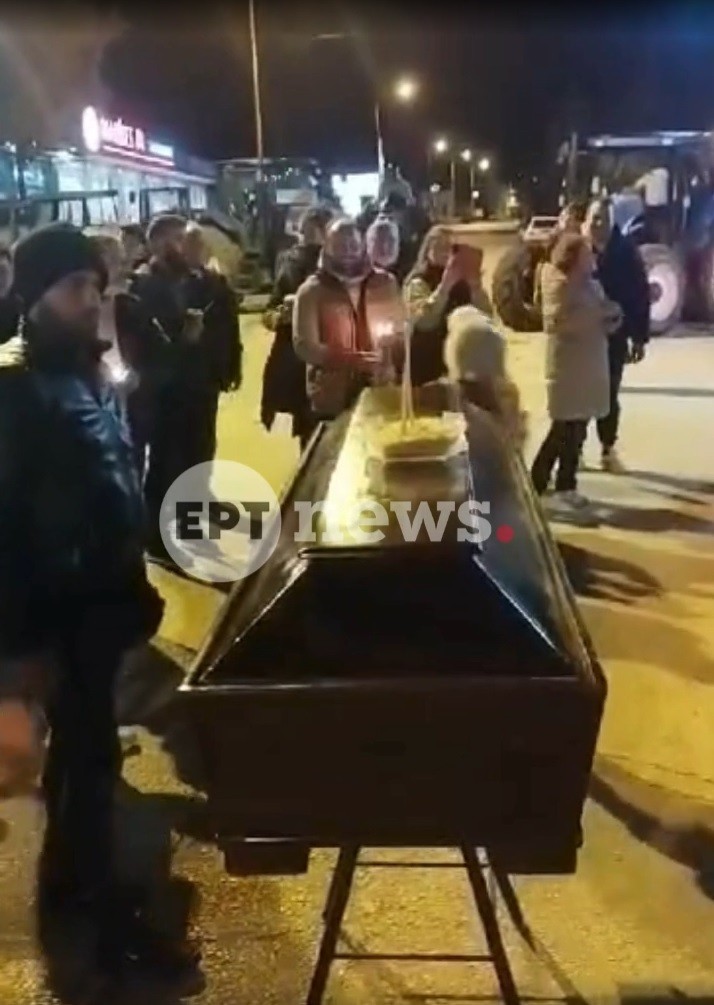 Σε μία συμβολική κίνηση προχώρησαν αγρότες και κτηνοτρόφοι από το μπλόκο του Καλπακίου, στήνοντας στη μέση του δρόμου ένα φέρετρο, σκεπασμένο με τη γαλανόλευκη σημαία.