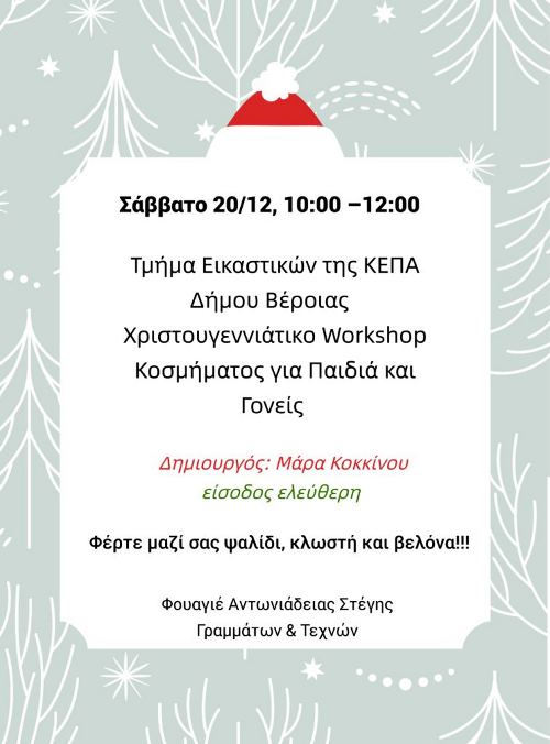 Ατζέντα εκδηλώσεων της Παρασκευής 19 και Σαββάτου 20 Δεκεμβρίου 2025, στο Φουαγιέ και στην σκηνή Οδυσσέας Γωνιάδης της Αντωνιάδειας Στέγης Γραμμάτων και Τεχνών, στο πλαίσιο του χριστουγεννιάτικου προγράμματος της ΚΕΠΑ Δ. Βέροιας: