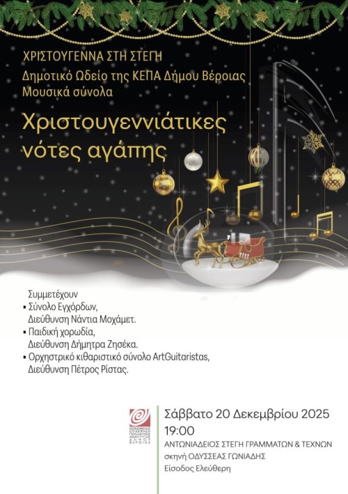 Συναυλία από μαθητές του Δημοτικού Ωδείου της ΚΕΠΑ Δήμου Βέροιας. Συμμετέχουν οι τάξεις μέσης και ανωτέρας των τμημάτων πιάνου, κιθάρας, βιολιού, φλάουτου, κλαρινέτου, σαξοφώνου των καθηγητών Θανάση Ρεπάνη, Πόπης Φιρτινίδου, Νάντιας Τζήμα, Σοφίας Παυλίδου, Ευφροσύνης Ράμου, Πέτρου Ρίστα, Χρήστου Σαρκατζή, Βασίλη Βαλαβάνη, Όλγας Καϊλόγλου, Γιάννη Στ. Βλάχου, Νάντιας Μοχάμετ, Δημήτρη Δομενικιώτη, Θανάση Γοβατζιδάκη, Ιβάν Ναβροζίδη και Βαλάντη Κυριακίδη σε χριστουγεννιάτικα έργα των συνθετών Mozart, Beethoven, Schubert, Chopin, Brahms, Tarrega και άλλων.