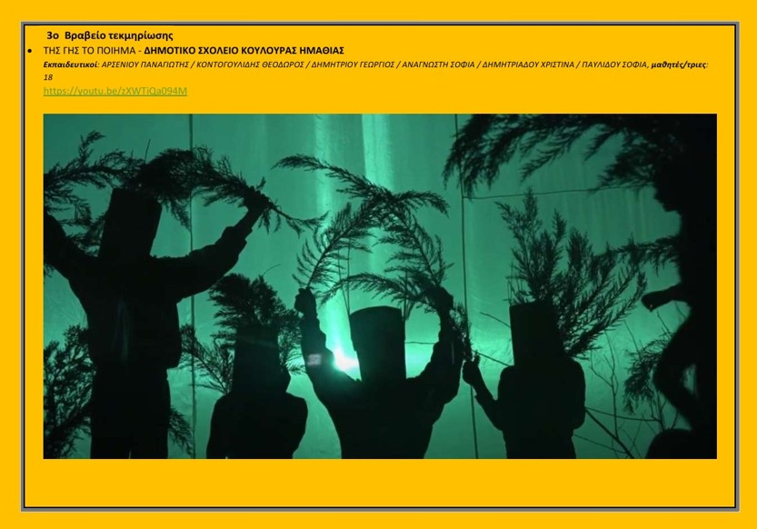 Το σχολείο πήρε έναν 1ο Έπαινο κι ένα 3ο Βραβείο Τεκμηρίωσης, με δημιουργίες που υλοποιήθηκαν στα πλαίσια της Στοχοθεσίας της Διαπίστευσης Erasmus+, σε αντίστοιχες συμμετοχές (παραλλαγή του ίδιου θέματος) σε Διεθνείς Μαθητικούς Διαγωνισμούς (7ος Διεθνής Μαθητικός Διαγωνισμός Οπτικοακουστικής Δημιουργίας ¨Τα σχολεία εκπέμπουν στην ΕΡΤ» & 15ος Διεθνής Μαθητικός Διαγωνισμός Ταινιών Μικρού Μήκους Cinema διάβασες;), αποτελούν την πραμάτεια του Δημοτικού Σχολείου Κουλούρας από την παραγωγή της ταινίας «Της Γης το ποίημα».