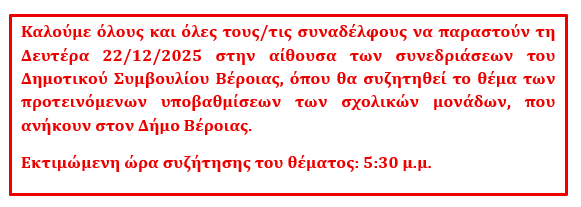 ΣΕΠΕ Ημαθίας: Όχι στις υποβαθμίσεις των σχολικών μονάδων / κάλεσμα για παρουσία στο Δημοτικό Συμβούλιο Βέροιας – Δευτέρα 22 Δεκεμβρίου