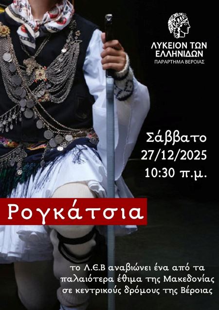 Ένα από τα παλαιότερα έθιμα της Μακεδονίας, τα Ρογκάτσια θα αναβιώσουμε ως Λύκειο των Ελληνίδων Βέροιας σε συνδιοργάνωση με το Δήμο Βέροιας το Σάββατο 27 Δεκεμβρίου σε κεντρικούς δρόμους της Βέροιας συνοδεία ζουρνάδων.