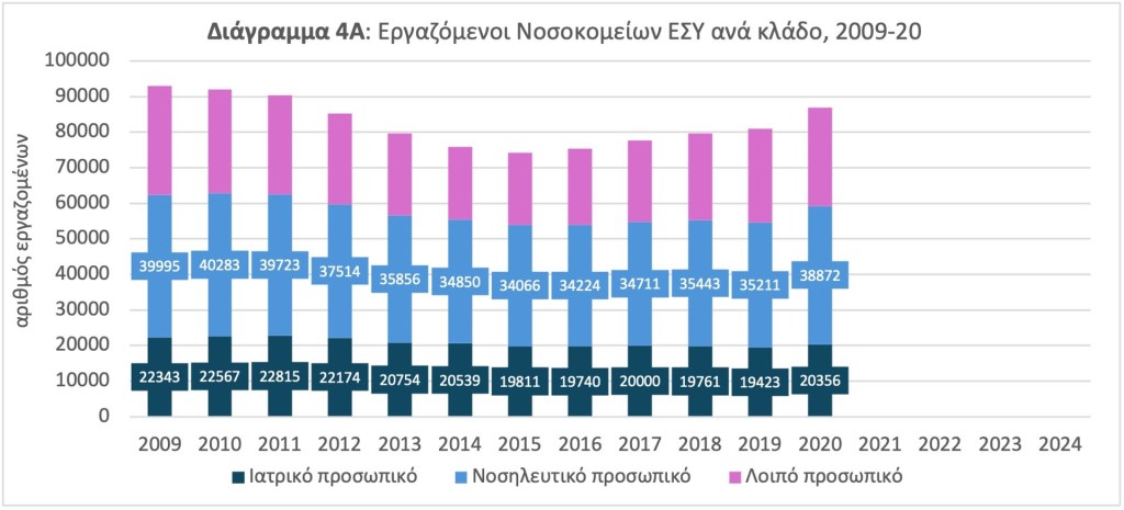 Ομοίως, η αύξηση κατά 9,7% του προσωπικού των νοσοκομείων του ΕΣΥ συνοδεύτηκε από μείωση κατά 0,5% του μόνιμου προσωπικού (341 μόνιμες θέσεις εργασίας), καταδεικνύοντας ότι «η ενίσχυση του ΕΣΥ σε ανθρώπινο δυναμικό την εν λόγω περίοδο υπήρξε εμβαλωματική». Δηλαδή έγιναν προσωρινές προσλήψεις για τις έκτακτες ανάγκες, την ίδια ώρα που το μόνιμο προσωπικό συνέχιζε να συρρικνώνεται εξαιτίας αποχωρήσεων, συνταξιοδοτήσεων κ.λπ.