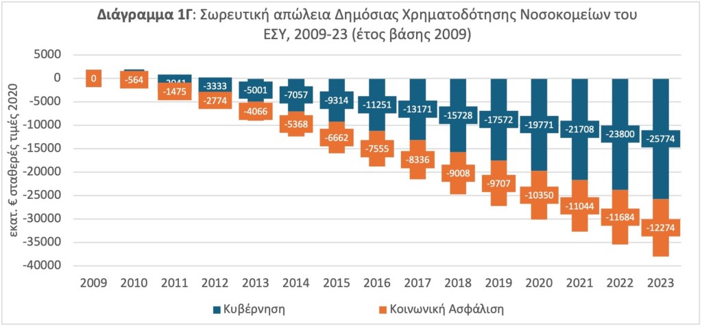 Για να γίνει αντιληπτό το μέγεθος της υποχρηματοδότησης και υποστελέχωσης του δημόσιου συστήματος Υγείας από όλες τις κυβερνήσεις, ακόμα και η επιστροφή στα προ κρίσεων επίπεδα – που σε καμία περίπτωση δεν καλύπτει τις πραγματικές λαϊκές ανάγκες – θα απαιτούσε την άμεση αύξηση της κρατικής χρηματοδότησης των νοσοκομείων κατά 2 δισ. ευρώ ετησίως (από 3,6 δισ. ευρώ το 2023 σε 5,6 δισ. ευρώ – σε σταθερές/αποπληθωρισμένες τιμές του 2020), όπως και την «ανάκτηση 5.778 νοσοκομειακών κλινών (ισοδύναμες δηλαδή 6 νοσοκομείων, δυναμικότητας το καθένα αντίστοιχης με αυτής του ΓΝ “Ευαγγελισμός” στην Αθήνα ή του ΓΝ “Ιπποκράτειο” στη Θεσσαλονίκη)».