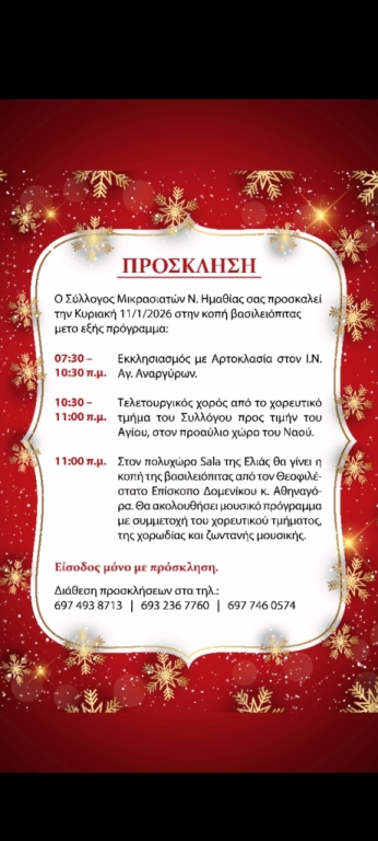 Βέροια Εκδηλώσεις Κοπή Βασιλειόπιτας από τον Σύλλογο Μικρασιατών Ημαθίας / Κυριακή 11 Ιανουαρίου Faretra.info 07/01/2026, 14:01 Share on Facebook Share on Twitter Send with mail Π Ρ Ο Σ Κ Λ Η Σ Η Ο Σύλλογος μας σας προσκαλεί την Κυριακή 11/1/2026 στην καθιερωμένη Κοπή Βασιλειόπιτας με το εξής πρόγραμμα! – Φαρέτρα Κοπή βασιλόπιτας Σύλλογος Μικρασιατών Ημαθίας. ΣΧΕΤΙΚΑ ΑΡΘΡΑ Αθλητικά Βέροια: Στις 13 & 14 Δεκεμβρίου ο 12ος Φιλίππειος δρόμος Μουσική Βέροια: Συναυλία της Μαρίας Παπαγεωργίου, αφιερωμένη στο έργο του Θάνου Μικρούτσικου / Χώρος Τεχνών, Πέμπτη 16 Οκτωβρίου Τοπικά Π.Ε. Ημαθίας: 1ο φεστιβάλ κυκλοφοριακής αγωγής, οδικής ασφάλειας και εθελοντισμού / Βέροια, Τετάρτη 15 Οκτωβρίου Βέροια Δημόσια Βιβλιοθήκη Βέροιας: «Το κάδρο της οικογένειας». Εργαστήριο για παιδιά / Δευτέρα 13 Οκτωβρίου Βέροια Βέροια: Πρόσκληση σε Γενική Συνέλευση από τη Μέριμνα Ατόμων με Αυτισμό / Κυριακή 19 Οκτωβρίου