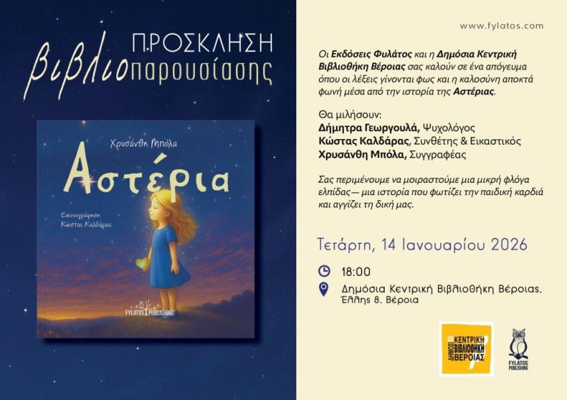 Την Τετάρτη 14 Ιανουαρίου 2026, στις 18:00, η αίθουσα εκδηλώσεων της Δημόσιας Κεντρικής Βιβλιοθήκης Βέροιας θα φιλοξενήσει την παρουσίαση του παιδικού βιβλίου «Αστέρια» της συγγραφέως Χρυσάνθης Μπόλα.