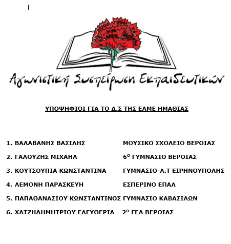 Όλοι εμείς που βρεθήκαμε στην ίδια πλευρά στον αγώνα για μόρφωση, δουλειά και ζωή με δικαιώματα κάνουμε τώρα το βήμα και στην ΕΛΜΕ Ημαθίας, με ακόμα πιο δυνατή την Αγωνιστική Συσπείρωση Εκπαιδευτικών, για: