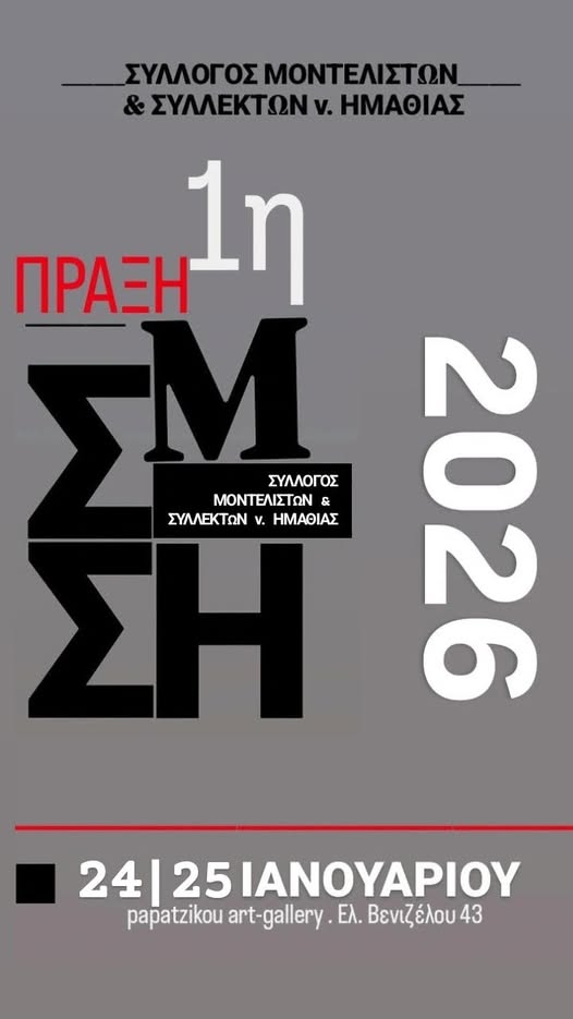 Ο Σύλλογος Μοντελιστών και Συλλεκτών ν. Ημαθίας, το διήμερο 24 & 25 Ιανουαρίου 2026, διοργανώνει την πρώτη του έκθεση «ΠΡΑΞΗ 1η», στην Γκαλερί Παπατζίκου, Ελ. Βενιζέλου 43 – Βέροια και σας προσκαλεί στα εγκαίνια της που θα πραγματοποιηθούν το Σάββατο 24 Ιανουαρίου, στις 18:30 το απόγευμα.