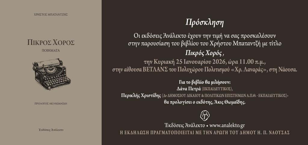 Την Κυριακή 25 Ιανουαρίου 2026, ώρα 11.00 π.μ., στην αίθουσα ΒΕΤΛΑΝΣ του Πολυχώρου Πολιτισμού «Χρήστος Λαναράς» στη Νάουσα, θα γίνει η παρουσίαση του πολύ σημαντικού βιβλίου του Χρήστου Μπαταντζή, «Πικρός Χορός» που μόλις κυκλοφόρησε από τη σειρά «Μικρή βιβλιοθήκη ποίησης» των εκδόσεων Ἀνάλεκτο. Η έκδοση και η εκδήλωση είναι ένας φόρος τιμής στον άνθρωπο που αφιέρωσε το πιο παραγωγικό κομμάτι της ζωής του στο θέατρο και την τέχνη. Για το βιβλίο θα μιλήσουν: η εκπαιδευτικός Δάνα Πετρά, και ο Δρ Δημοσίου Δικαίου & Πολιτικών Επιστημών Α.Π.Θ. – εκπαιδευτικός Περικλής Χριστίδης· θα προλογίσει ο εκδότης Άκις Θωμαΐδης. Η εκδήλωση πραγματοποιείται με την αρωγή του Δήμου Η.Π. Νάουσας.