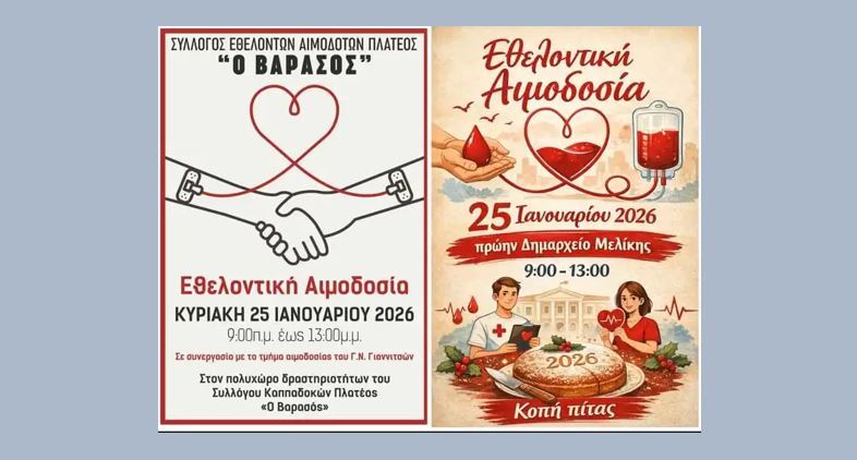 Την Κυριακή 25 Ιανουαρίου 2026, και ώρα 9:00 π.μ. έως 13:00 μ.μ. στο πρώην Δημαρχείο Μελίκης θα πραγματοποιηθεί Εθελοντική Αιμοδοσία.