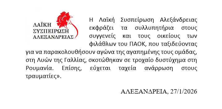 Αλεξάνδρεια Κοινωνική ζωή Συλλυπητήρια της Λαϊκής Συσπείρωσης Αλεξάνδρειας για τον θάνατο των επτά οπαδών του ΠΑΟΚ στη Ρουμανία Faretra.info 27/01/2026, 22:01 Share on Facebook Share on Twitter Send with mail Φαρέτρα θάνατος Λαϊκή Συσπείρωση Αλεξάνδρειας ΠΑΟΚ Ρουμανία ΣΧΕΤΙΚΑ ΑΡΘΡΑ Αλεξάνδρεια Συλλυπητήριο Μήνυμα του Δημάρχου Αλεξάνδρειας για το πολύνεκρο δυστύχημα στην Ρουμανία Κοινωνική ζωή Όμιλος φίλων Θεάτρου και Τεχνών Βέροιας στη μνήμη του Δημήτρη Καρολίδη Αλεξάνδρεια Λαϊκή Συσπείρωση Αλεξάνδρειας: Όχι στο κλείσιμο του καταστήματος των ΕΛΤΑ Αστυνομικό Δελτίο Αλεξάνδρεια: Τροχαίο δυστύχημα με 71χρονη νεκρή και δυο τραυματίες Νάουσα Συλλυπητήριο μήνυμα της Ευξείνου Λέσχης Νάουσας για την απώλεια της Ολυμπίας Ιωσηφίδου Βέροια Βέροια: Έφυγε από τη ζωή ο φαρμακοποιός Γεώργιος – Ξάνθιππος Τροχόπουλος, ο ανήσυχος και δημιουργικός