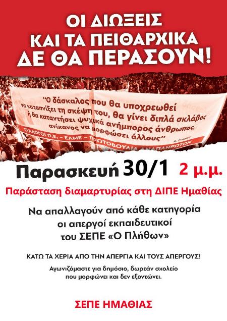 ΣΕΠΕ Ημαθίας: Κάλεσμα σε παράσταση διαμαρτυρίας στη ΔΙΠΕ Ημαθίας ενάντια στις πειθαρχικές διώξεις των απεργών εκπαιδευτικών / Παρασκευή 30 Ιανουαρίου