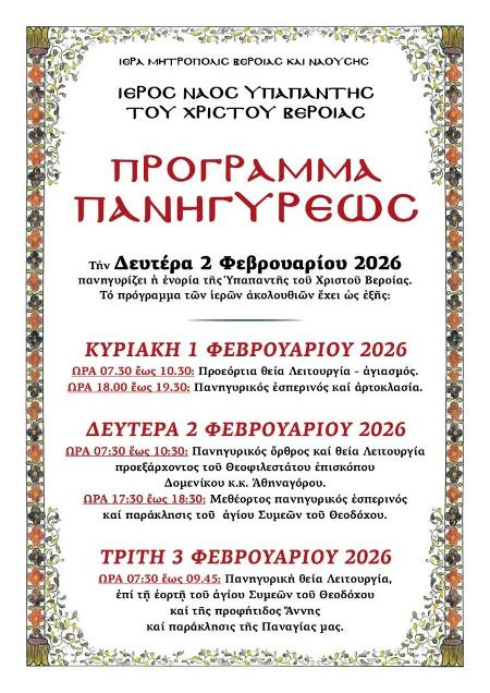 | Τήν Δευτέρα 2 Φεβρουαρίου 2026 πανηγυρίζει ἡ ἐνορία τῆς Ὑπαπαντῆς τοῦ Χριστοῦ Βεροίας. Τό πρόγραμμα τῶν ἱερῶν ἀκολουθιῶν ἔχει ὡς ἐξῆς: |