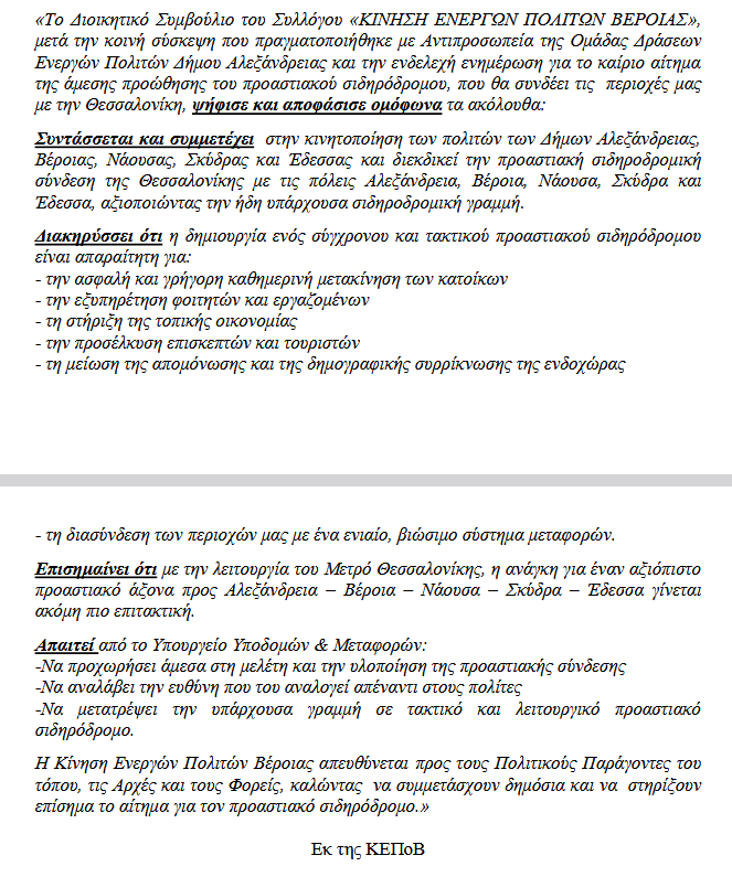 //Συντάσσεται και συμμετέχει στην κινητοποίηση των πολιτών των Δήμων Αλεξάνδρειας, Βέροιας, Νάουσας, Σκύδρας και Έδεσσας και διεκδικεί την προαστιακή σιδηροδρομική σύνδεση της Θεσσαλονίκης με τις πόλεις Αλεξάνδρεια, Βέροια, Νάουσα, Σκύδρα και Έδεσσα, αξιοποιώντας την ήδη υπάρχουσα σιδηροδρομική γραμμή\\