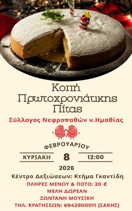 Την κοπή της βασιλόπιτας στον ετήσιο χορό του θα πραγματοποιήσει ο Σύλλογος Νεφροπαθών Ημαθίας, την Κυριακή 8 Φεβρουαρίου 2026, στις 12:00, στο Κέντρο Δεξιώσεων Γκαντίδη στον Άγιο Γεώργιο.