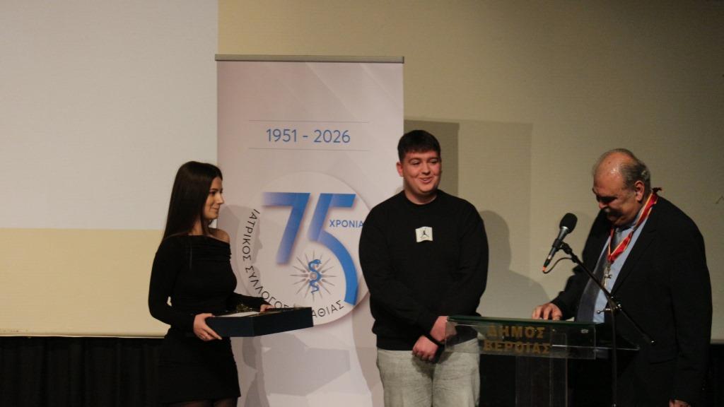 Ανακοίνωσε στη συνέχεια πως ο ΙΣΗ ομόφωνα αποφάσισε να βραβεύει από τη φετινή χρονιά τον πρώτο μαθητή της Ημαθίας που μπήκε στην Ιατρική Σχολή και βράβευσε έτσι την Φένια Τσαχουρίδου που παρέλαβε, πέρα από την τιμητική πλακέτα και ένα συμβολικό χρηματικό ποσό.