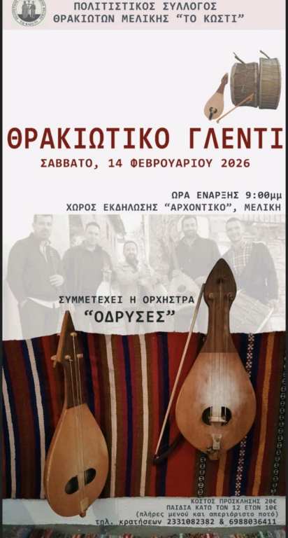 Πολιτιστικός Σύλλογος Θρακιωτών Μελίκης «Το Κωστι»: Πρόσκληση σε Θρακιώτικο Γλέντι / Σάββατο 14 Φεβρουαρίου